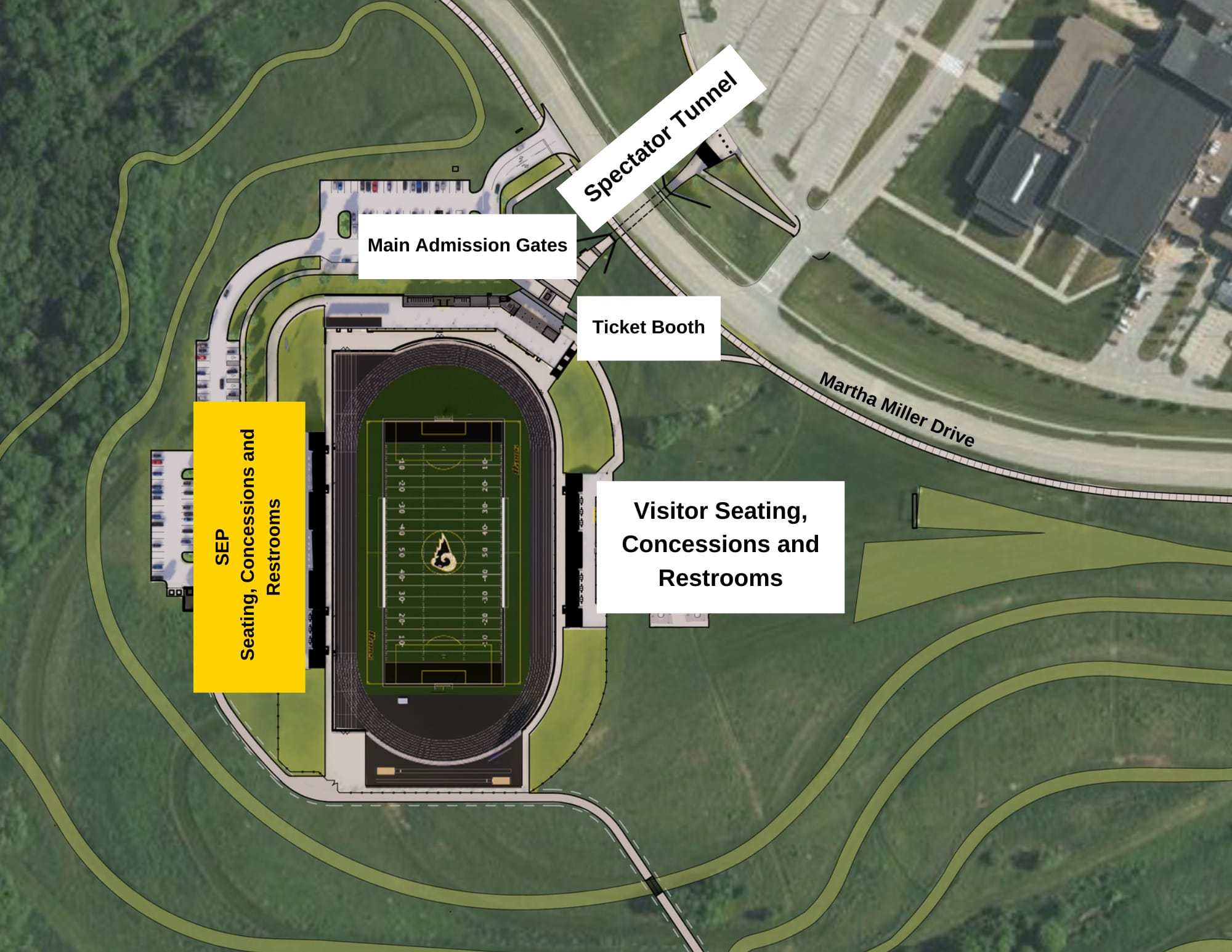 The main admission gate is located on the Northeast corner of the stadium by the Ram statue. Access to the stadium will be via the tunnel under Martha Miller Drive. For safety reasons, please do not walk across Martha Miller Drive to get from the High School parking areas to the stadium.