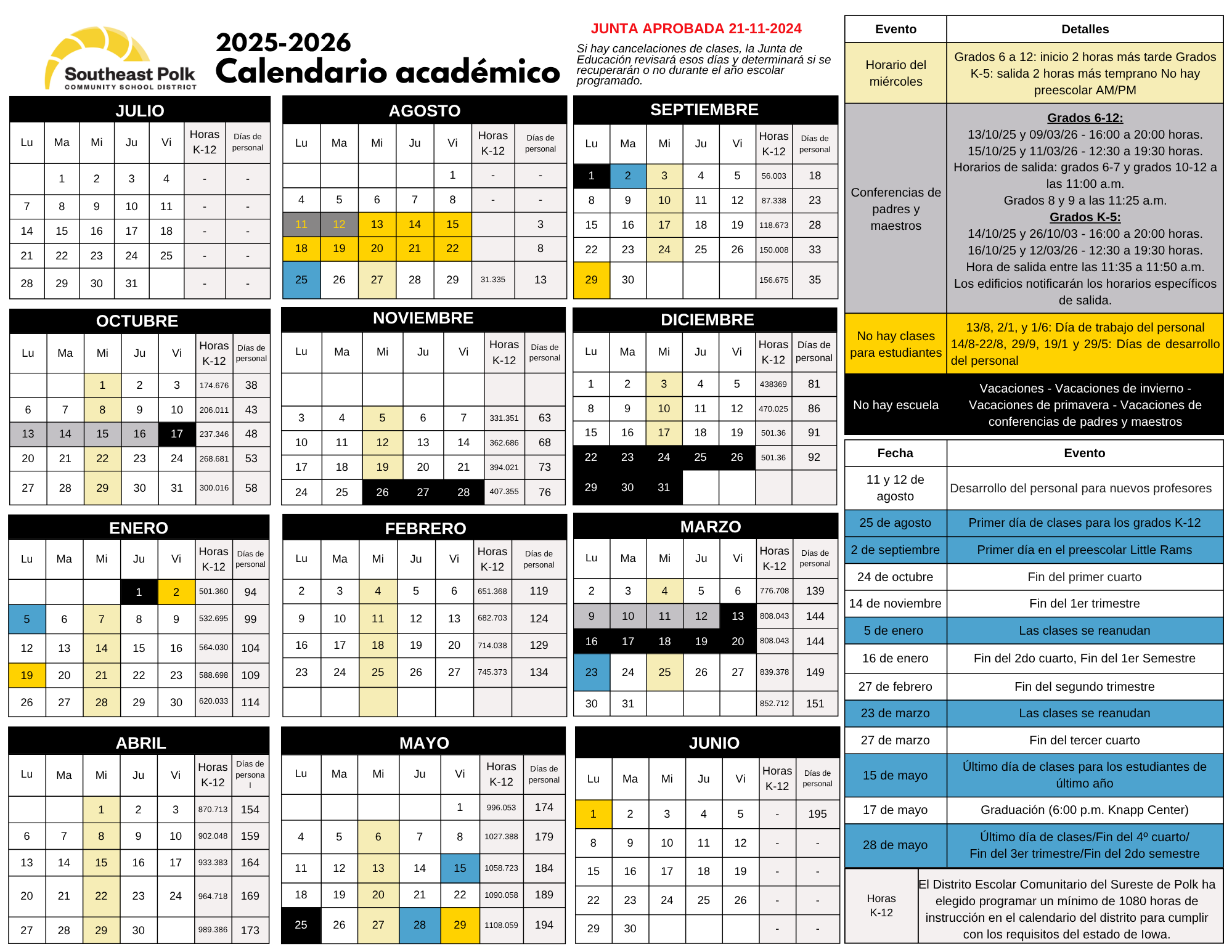 Please click on the links to view the academic “Year-at-a-Glance” calendar. This calendar provides information regarding no-school days, parent-teacher conferences, staff professional development days, and more. All calendars are posted in PDF format, which can be printed from your computer. Questions regarding the calendars can be directed to the Communications office.