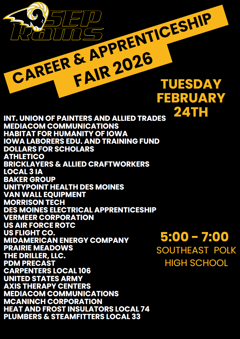 Southeast Polk High School is hosting its annual Career and Apprenticeship Fair on Tuesday, February 24, 2026!