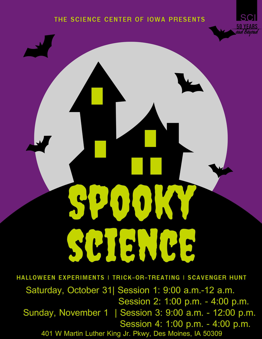 See the attached informational flyer that our students created as part of their marketing campaign. These students would love to see some Southeast Polk families at the Science Center for a spooky, fun time exploring science!