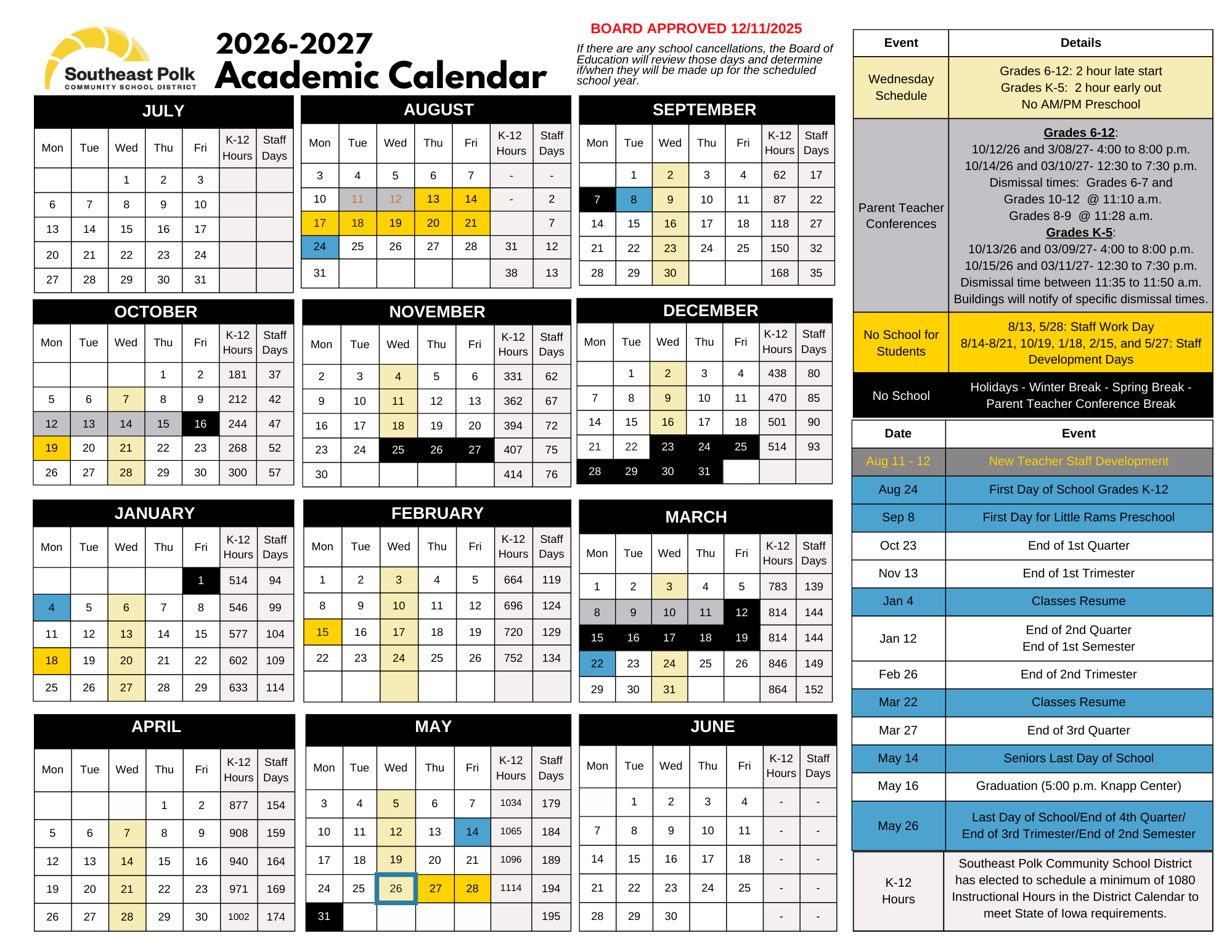 Southeast Polk Community School District's Winter Break will run Monday, December 22, 2025, through Friday, January 2, 2026, with classes resuming on Monday, January