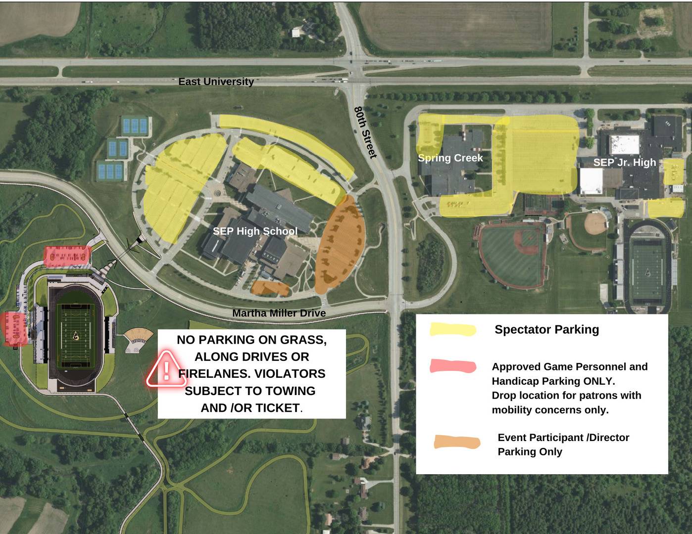 - The parking lots on the west and north of the high school, as well as the parking lots near Spring Creek and the Junior High are designated for game spectator parking.